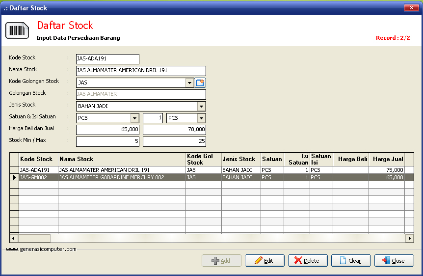 Aplikasi Administrasi Jasa Pembuatan Perlengkapan Wisuda dan AksesorisDibaca: 2382 kaliProgram Aplikasi Penjualan Perlengkapan Wisuda - Aplikasi ini sangat cocok untuk usaha penjualan perlengkapan wisuda Fitur Program Aplikasi Administrasi Jasa Pembuatan Perlengkapan Wisuda dan Aksesoris :