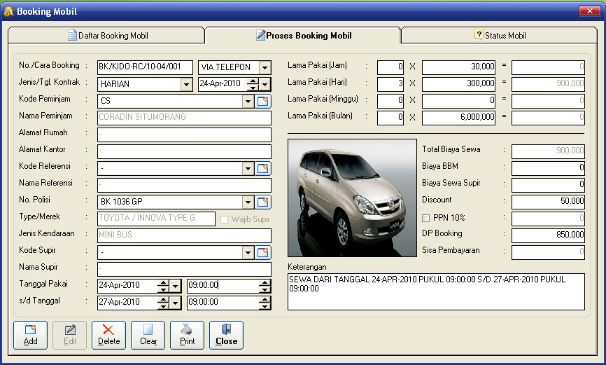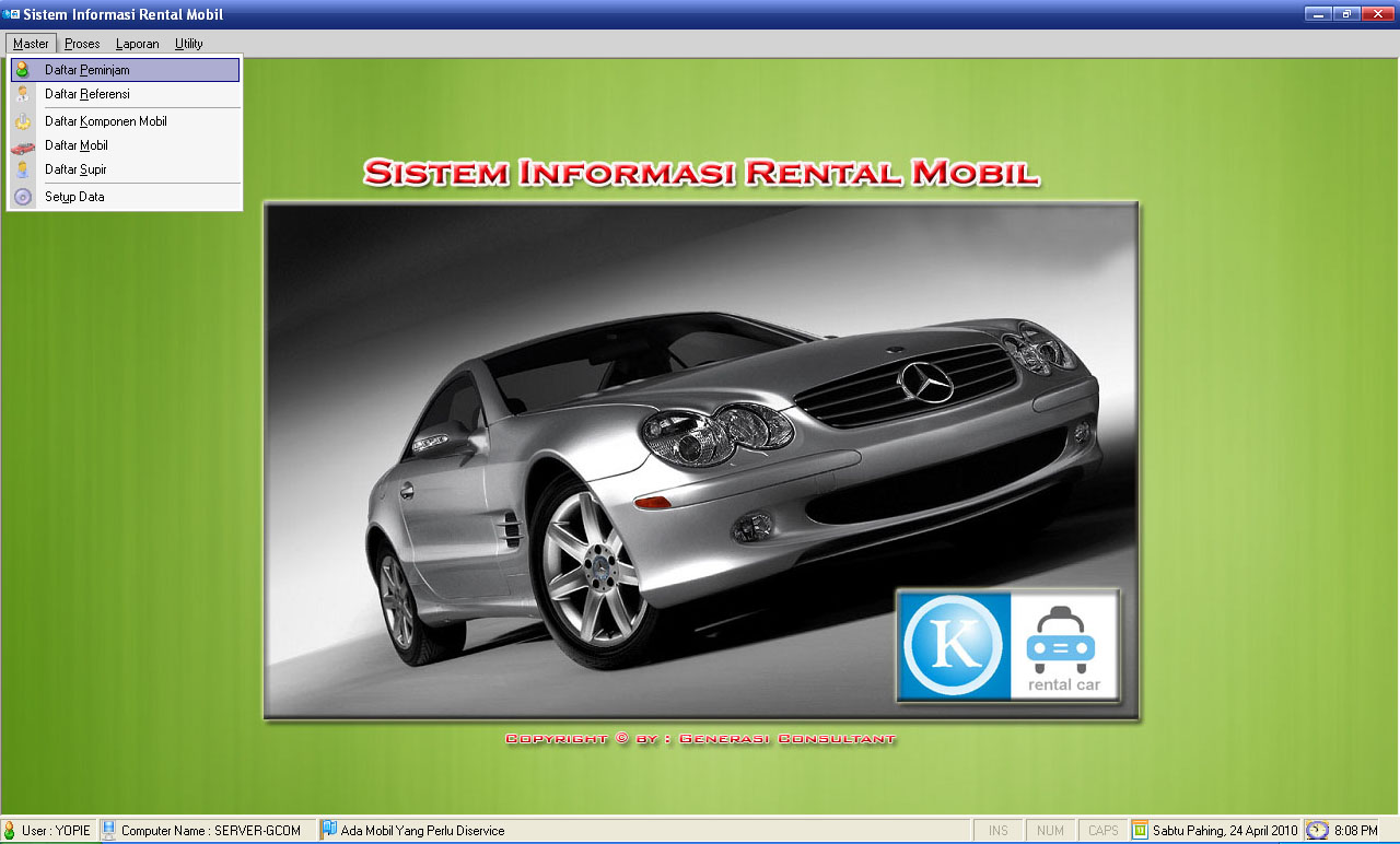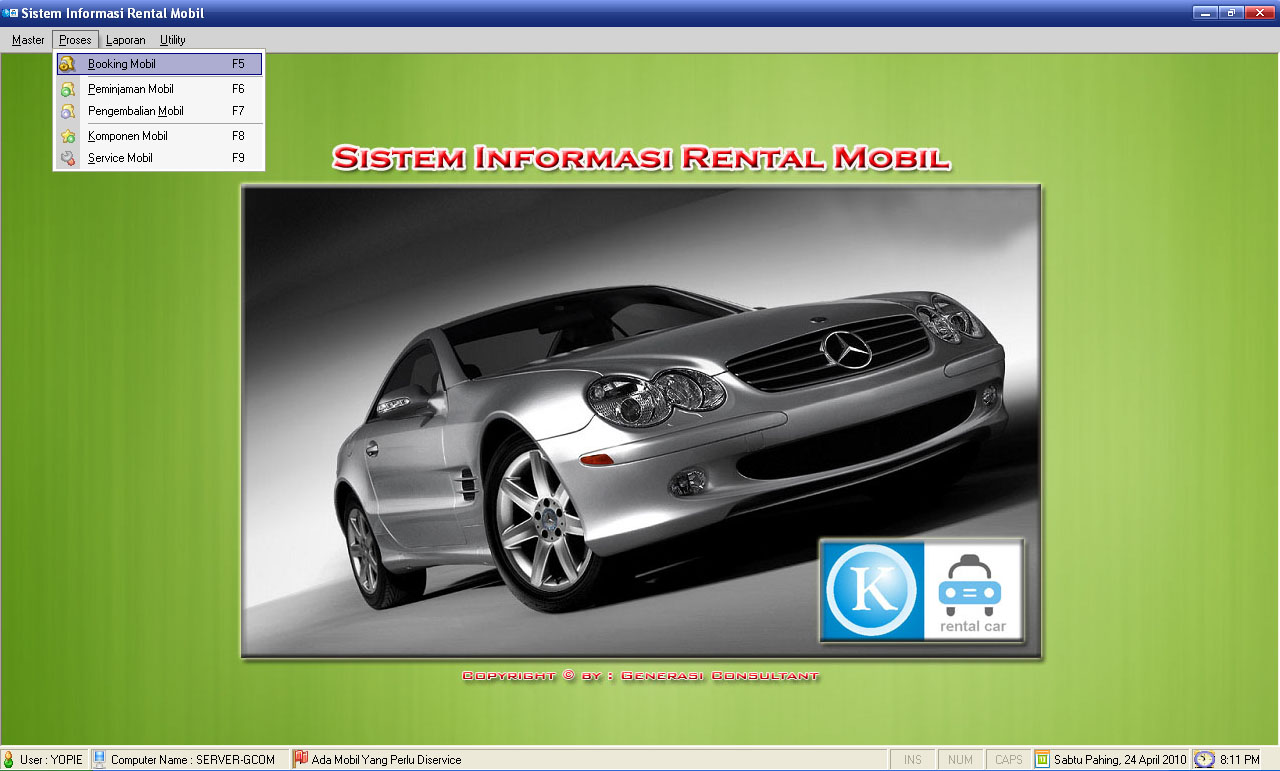 Aplikasi Administrasi Rental MobilDibaca: 5081 kaliProgram Aplikasi Rental Mobil - aplikasi ini sangat cocok untuk jasa rental mobil yang memiliki masalah dalam menangani pencatatan transaksi sewa menyewa mobil. Fitur Program Aplikasi Administrasi Rental Mobil :