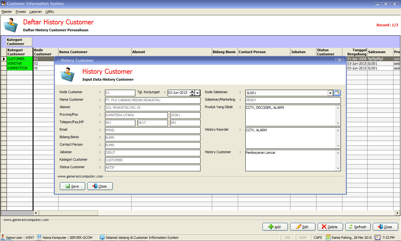 Aplikasi CustomerDibaca: 3207 kaliProgram Aplikasi Customer List - aplikasi history customer ini sangat cocok untuk menangani daftar customer aktif/lepas/blacklist/kompetitor. Fitur Program Aplikasi Customer :