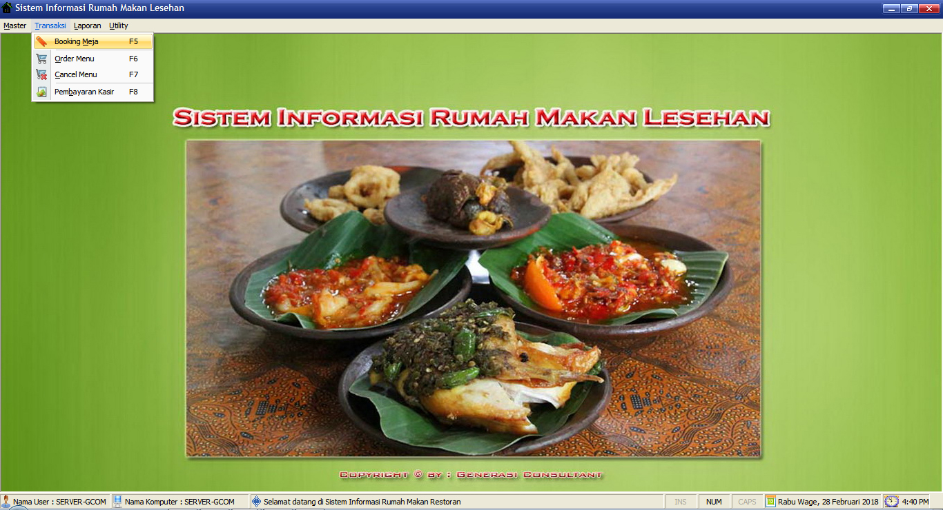 Aplikasi Rumah Makan LesehanDibaca: 2141 kaliSoftware Program Aplikasi Rumah Makan Lesehan - aplikasi restoran lesehan dengan sistem penjualan take away dan dine-in, support barcode reader dan foto produk, dengan harga terjangkau dan sangat mudah digunakan. Silahkan hubungi kami di 08126514562 Fitur Program Aplikasi Rumah Makan Lesehan :