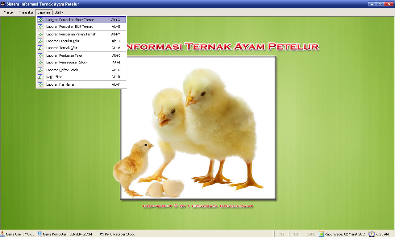 Aplikasi Ternak Ayam PetelurDibaca: 6119 kaliSoftware Program Aplikasi Ternak Ayam Petelur - aplikasi ini sangat cocok untuk pengusaha ternak ayam petelur yang mengalami kesulitan dalam pencatatan data transaksi sehari-hari. Fitur Program Aplikasi Ternak Ayam Petelur :