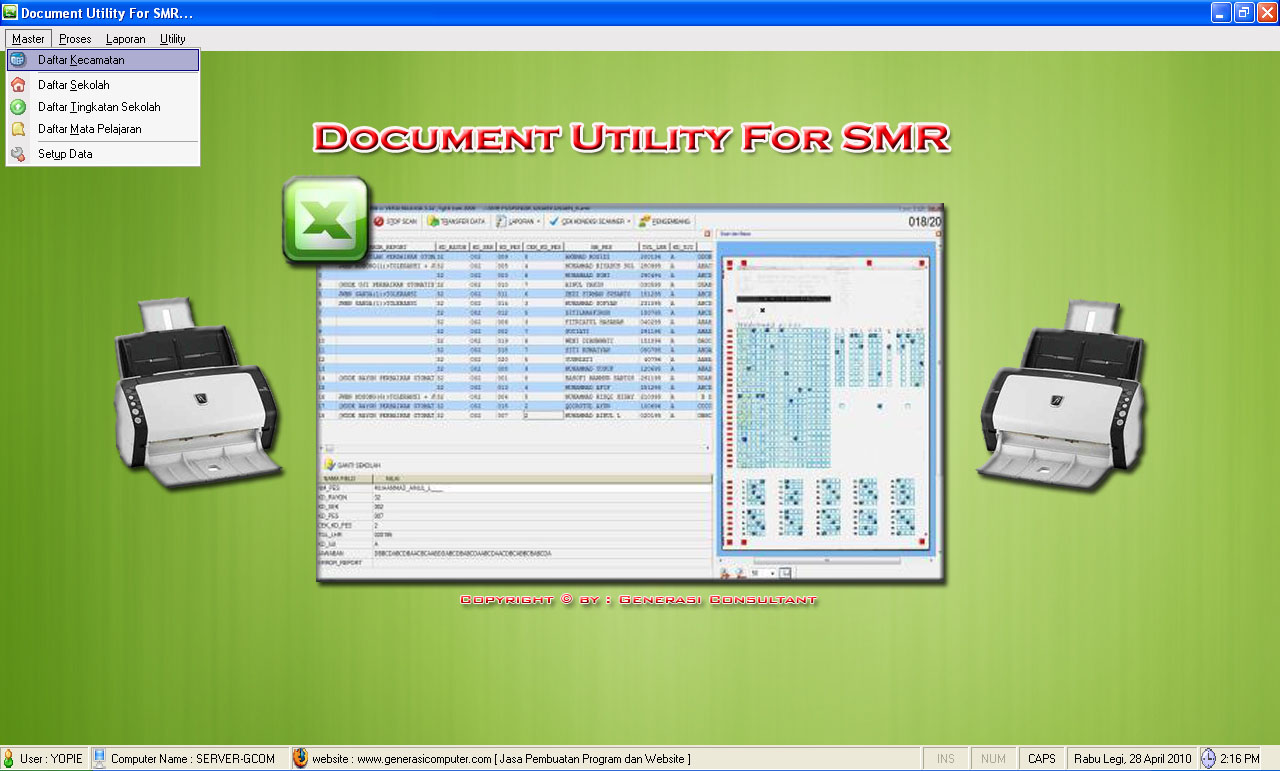 Utility For SMR DocumentDibaca: 2948 kaliProgram Aplikasi Utility For SMR Document - aplikasi scanner lembar jawaban komputer ini sangat cocok untuk perusahaan yang menyediakan jasa scan hasil ujian nasional. Aplikasi ini dapat memformat ulang hasil scan LJK dengan border dsb, selain harga terjangkau aplikasi ini sangat mudah digunakan. Silahkan hubungi kami di 08126514562 Fitur Program Utility For SMR Document :