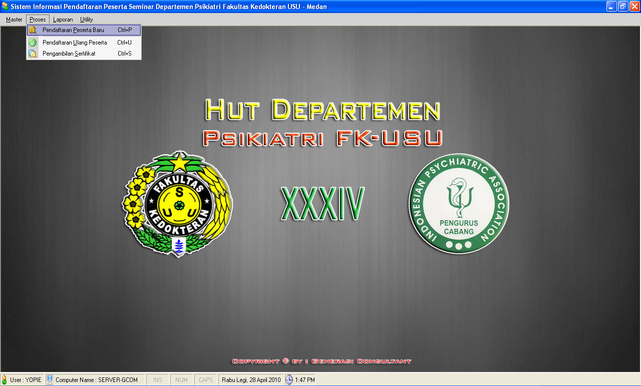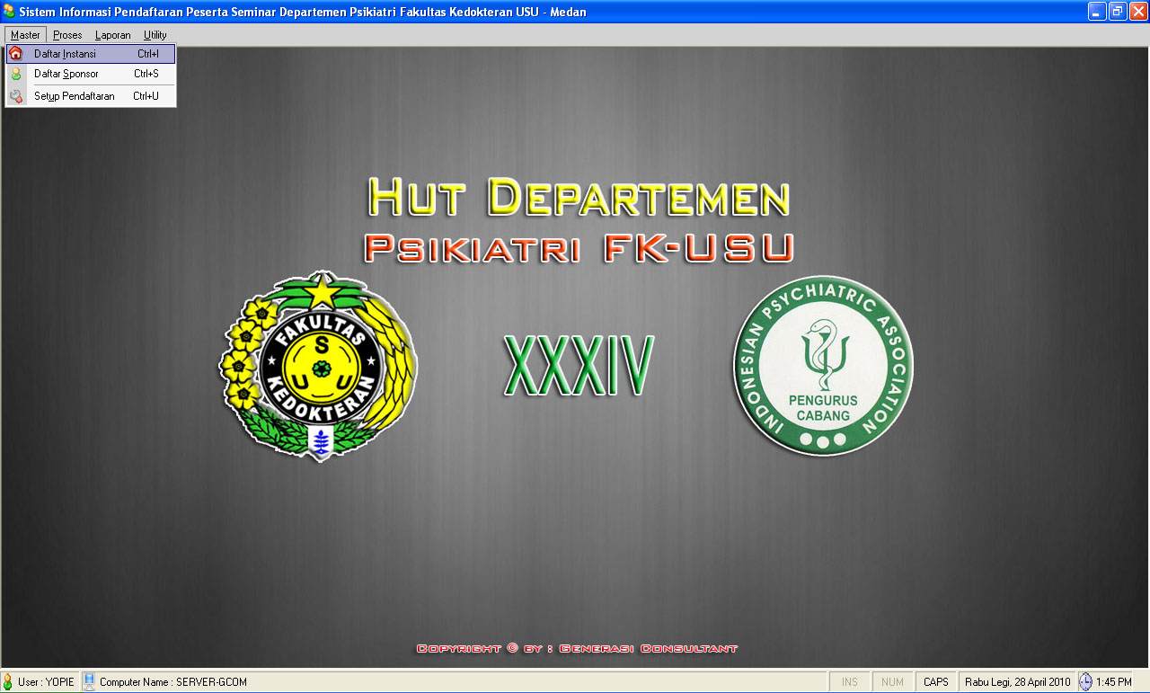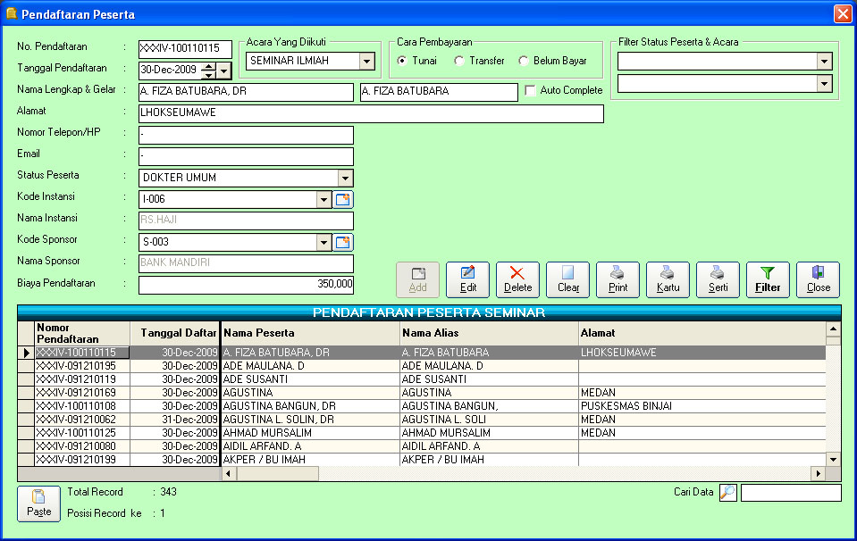 Aplikasi Administrasi Pendaftaran Peserta Seminar/Workshop Ilmu KedokteranDibaca: 3945 kaliProgram Aplikasi Pendaftaran Peserta Seminar dan Workshop - Sistem Informasi Pendaftaran Peserta Seminar ini sangat cocok untuk organisasi yang sedang mengadakan sebuah acara, sehingga informasi dapat diperolah dengan cepat dan akurat - Silahkan hubungi kami di 08126514562 Fitur Program Aplikasi Administrasi Pendaftaran Peserta Seminar/Workshop Ilmu Kedokteran :