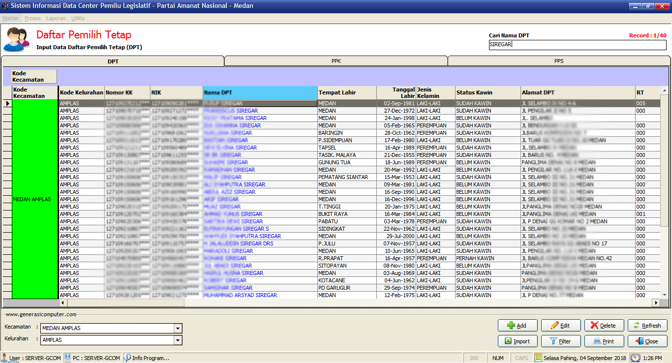 Aplikasi Data Center Pemilu LegislatifDibaca: 2467 kaliAplikasi Data Center Daftar Pemilih Tetap Pemilu Legislatif sangat cocok sebagai indikator potensi suara yang bisa diperoleh. Sangat membantu caleg dalam memetakan kampanye. Fitur Program Aplikasi Data Center Pemilu Legislatif :