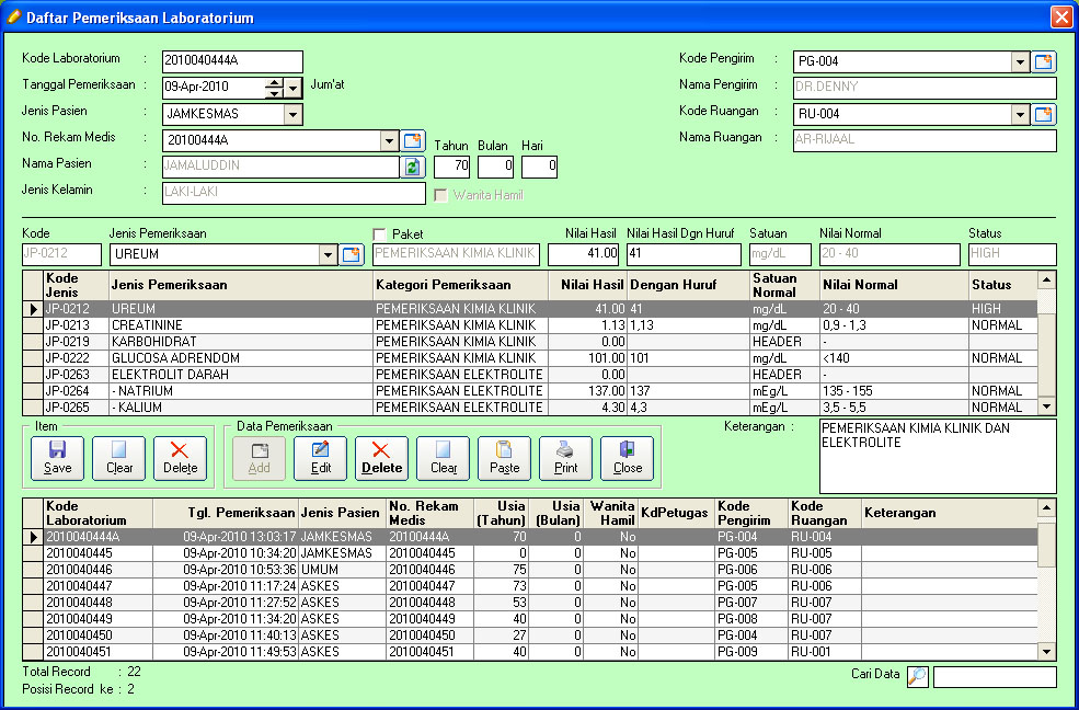 Aplikasi Hasil Pemeriksaan Laboratorium KlinikDibaca: 4852 kaliSoftware Program Hasil Pemeriksaan Laboratorium Klinik - aplikasi hasil pemeriksaan laboratorium disertai standard nilai normal, sangat cocok untuk laboratorium klinik maupun laboratorium rumah sakit. Silahkan hubungi kami di 08126514562 Fitur Program Aplikasi Hasil Pemeriksaan Laboratorium Klinik :