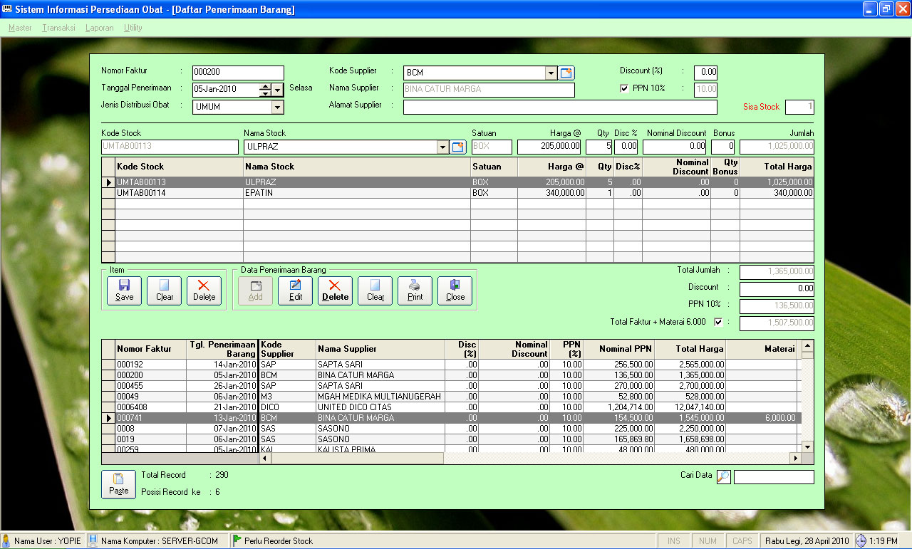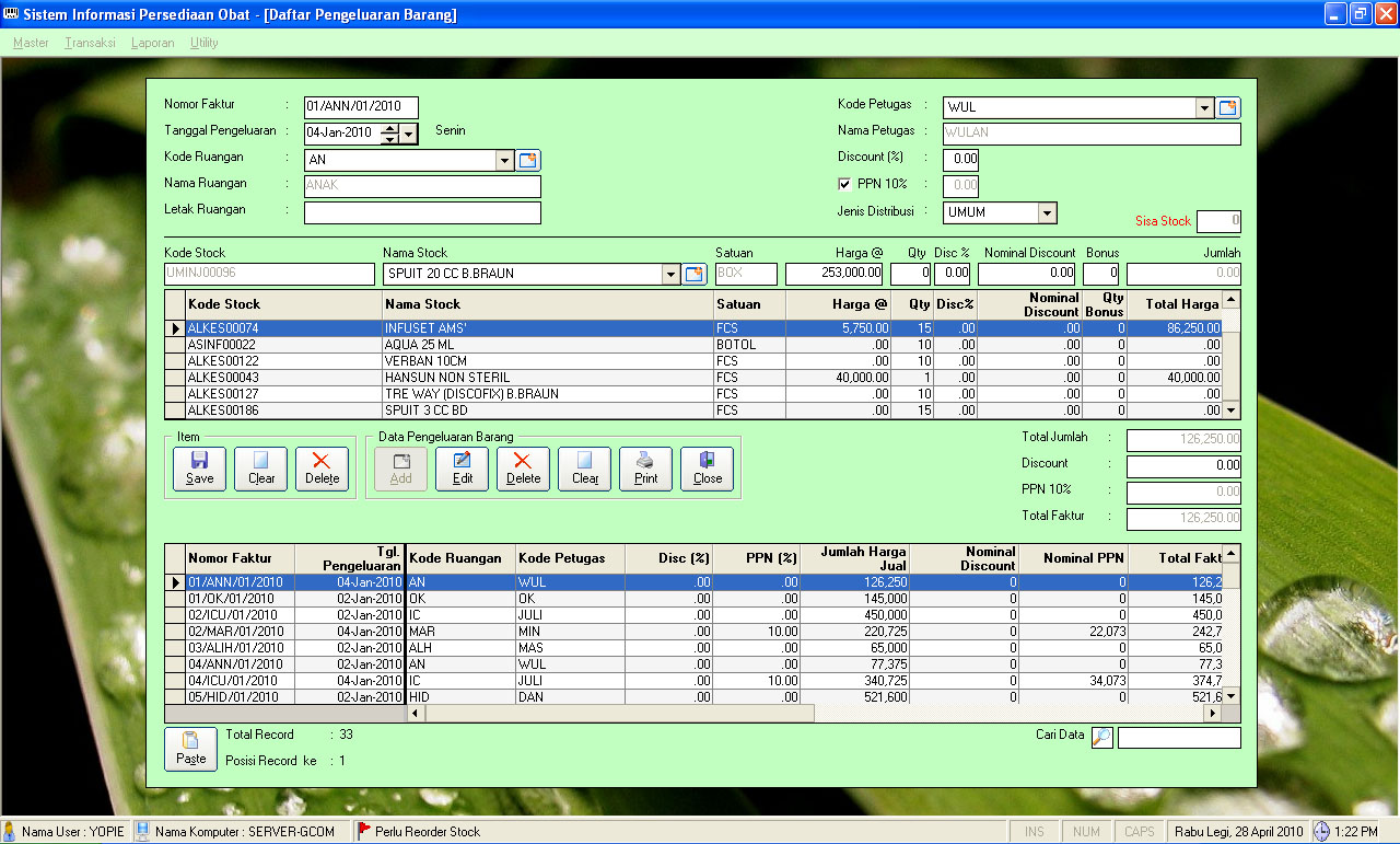 Aplikasi Persediaan Obat Rumah SakitDibaca: 3108 kaliSoftware Program Aplikasi Persediaan Obat Rumah Sakit - aplikasi persediaan obat rumah sakit sangat cocok untuk mengatasi permasalahan dalam pencatatan obat masuk dan obat keluar dari gudang rumah sakit. Silahkan hubungi kami di 08126514562 Fitur Program Aplikasi Persediaan Obat Rumah Sakit :