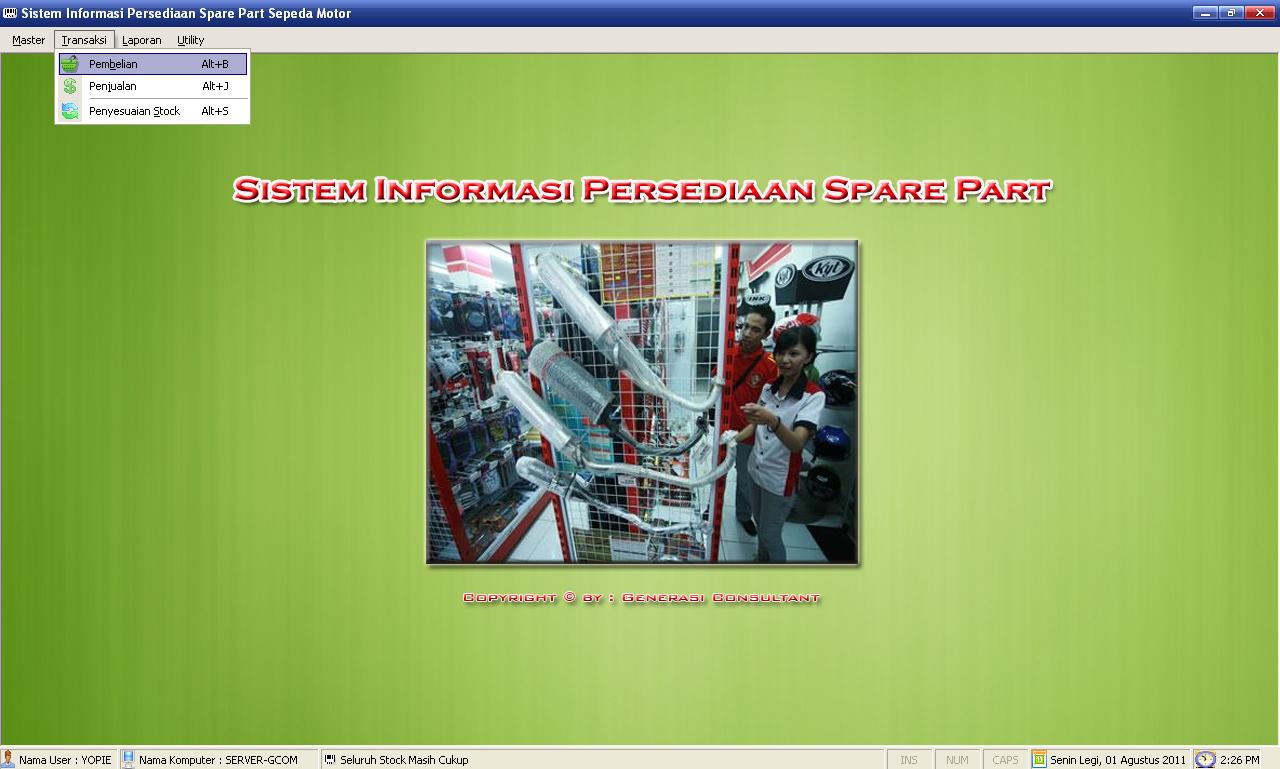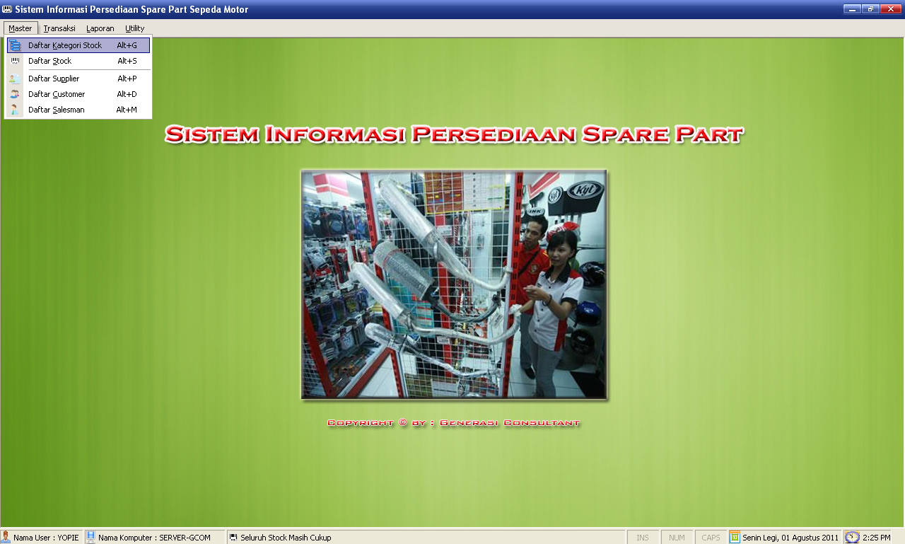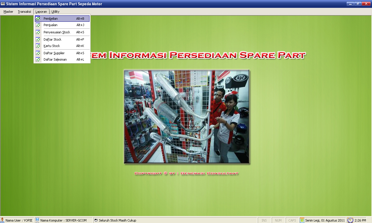 Aplikasi Persediaan Spare Part Sepeda MotorDibaca: 3437 kaliProgram Aplikasi Sparepart Sepeda Motor - aplikasi persediaan spare part sepeda motor ini sangat cocok sebagai alat kontrol persediaan toko spare part sepeda motor Fitur Program Aplikasi Persediaan Spare Part Sepeda Motor :