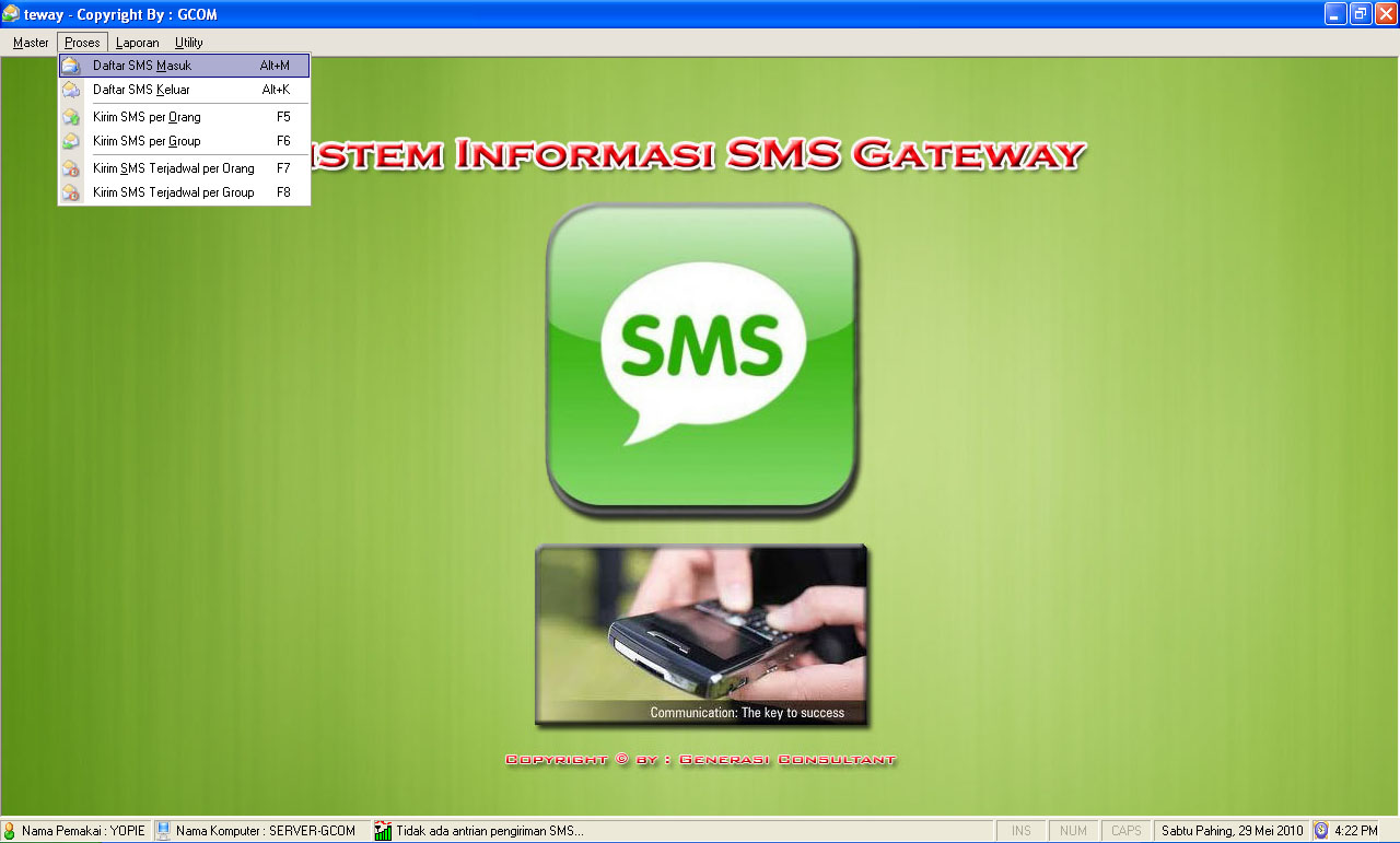 Aplikasi SMS Center MasjidDibaca: 2458 kaliAplikasi kirim SMS massal Anggota STM/Wirid, SMS terjadwal Anggota STM/Wirid, SMS Autorespon Anggota STM/Wirid, template SMS, long SMS (lebih dari 160 karakter), filter pengiriman ganda SMS, multi user cukup 1 modem saja dan untuk admin dapat mengirim SMS massal via HP yang akan diteruskan oleh aplikasi sms gateway) cocok sebagai pengingat tagihan iuran STM jatuh tempo, undangan rapat, pendaftaran online, info pengajian, info wirid, info kemalangan, info qurban dll. Fitur Program Aplikasi SMS Center Masjid :
