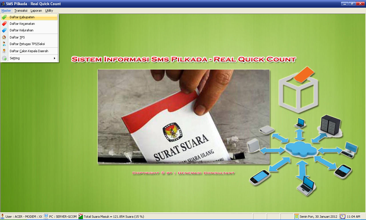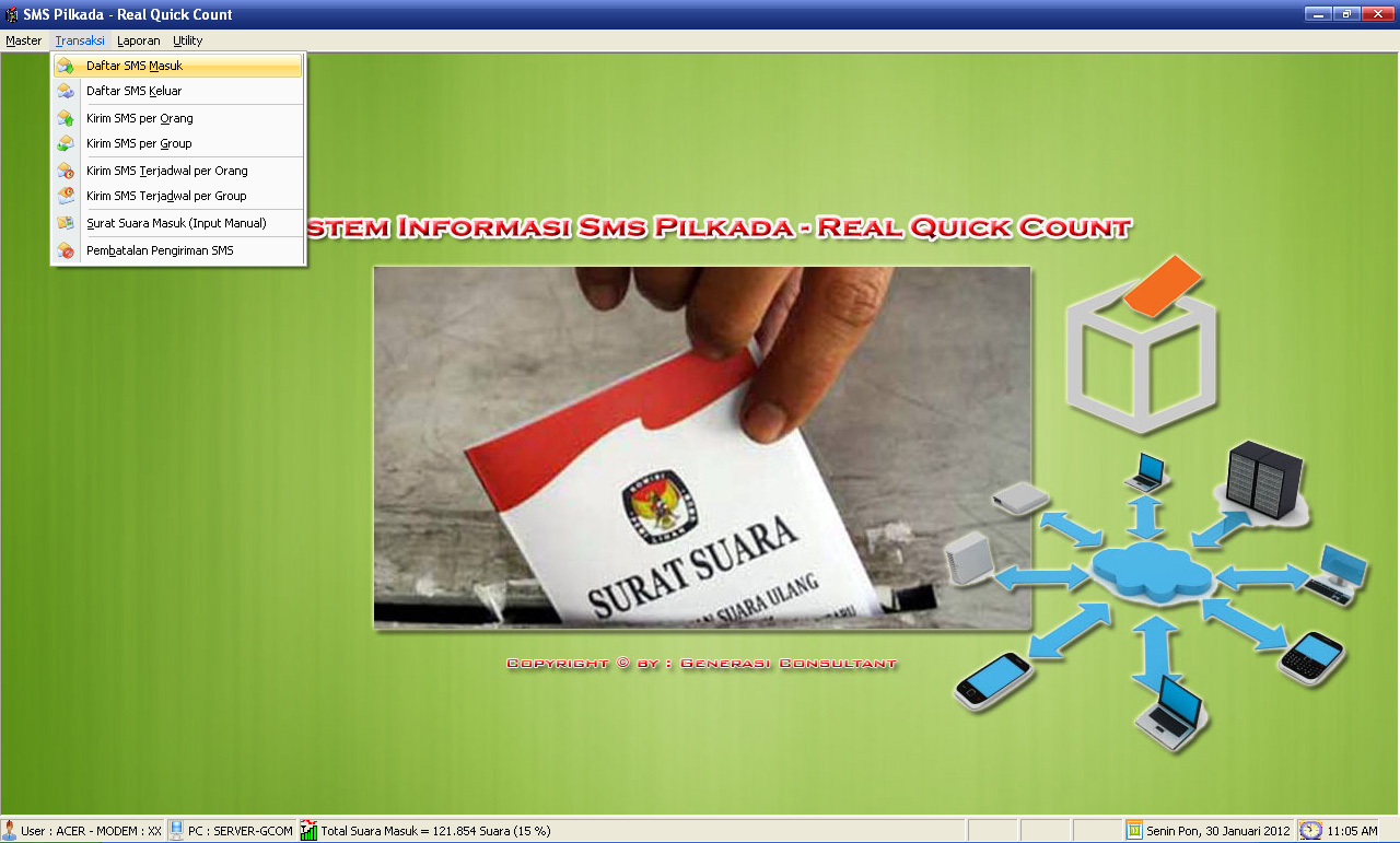 Aplikasi SMS Gateway PilkadaDibaca: 3142 kaliSoftware Program Aplikasi Real Quick Count SMS Gateway Pemilu Kepala Daerah - Aplikasi SMS Gateway Pilkada ini sangat cocok untuk proses cepat perhitungan suara pemilihan kepala daerah. Silahkan hubungi kami di 08126514562 Fitur Program Aplikasi SMS Gateway Pilkada :