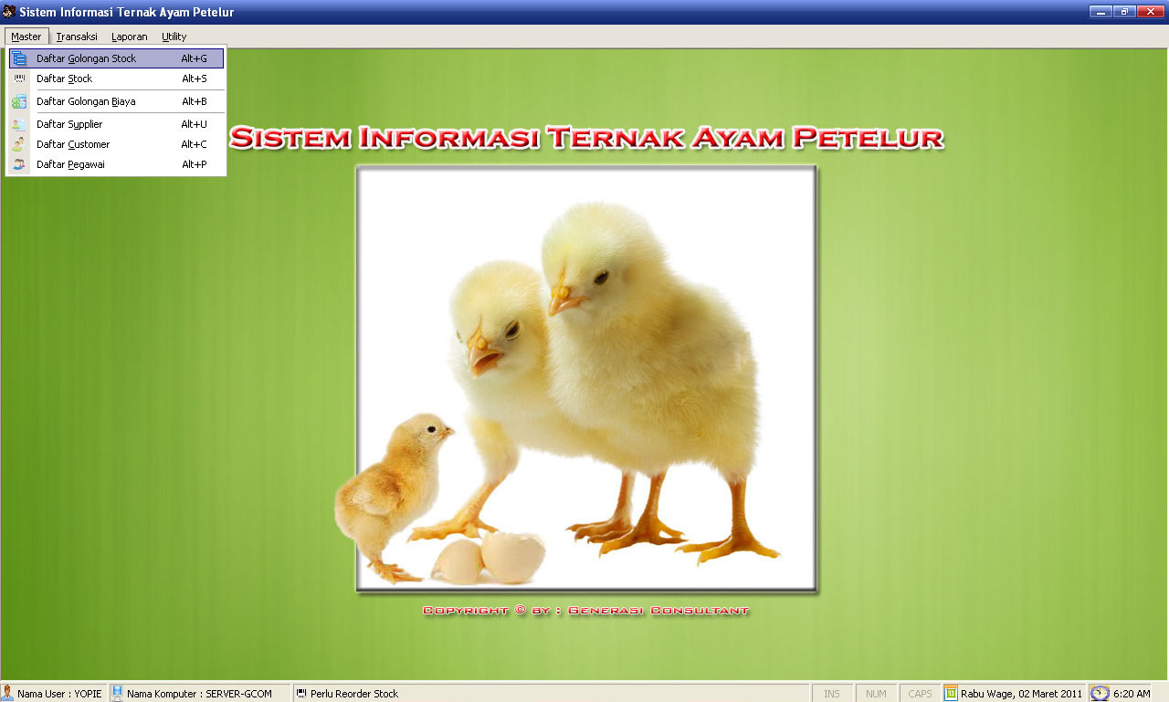 Aplikasi Ternak Ayam PetelurDibaca: 6126 kaliSoftware Program Aplikasi Ternak Ayam Petelur - aplikasi ini sangat cocok untuk pengusaha ternak ayam petelur yang mengalami kesulitan dalam pencatatan data transaksi sehari-hari. Fitur Program Aplikasi Ternak Ayam Petelur :